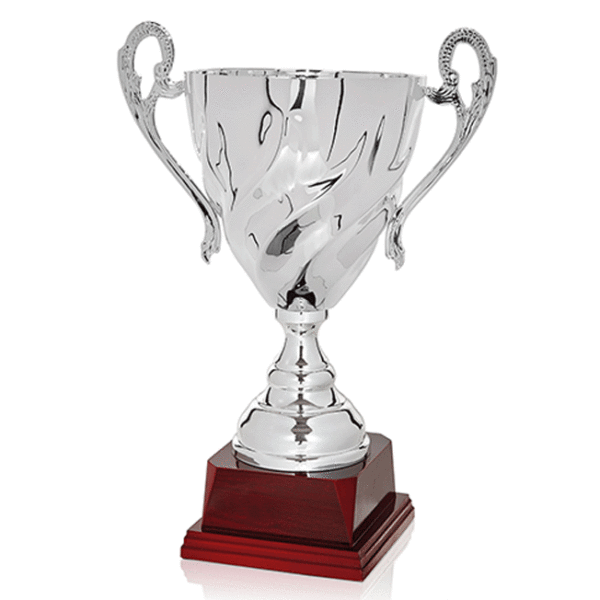 Trofeo metálico color plateado.