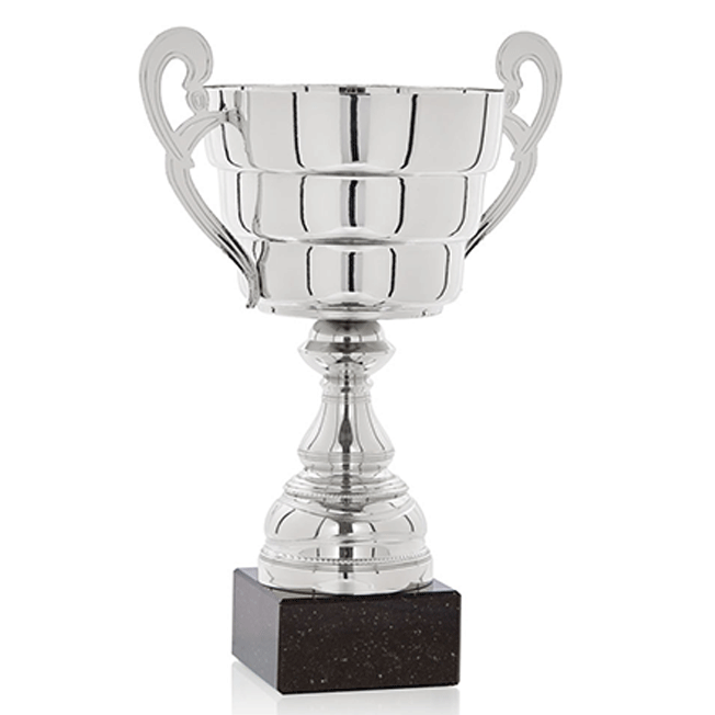 Trofeo metálico color plata.