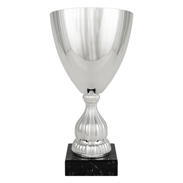 Copa clásica plateada con peana de mármol. Incorpora placa de aluminio con grabado láser incluido. Disponible en 6 tamaños.