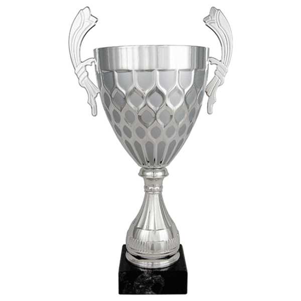 Copa clásica plateada con peana de mármol. Incorpora placa de aluminio con grabado láser incluido. Disponible en 5 tamaños.