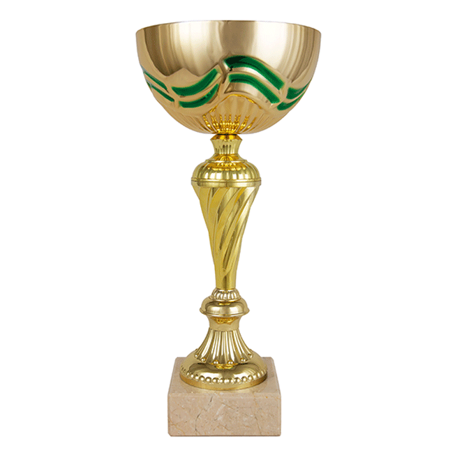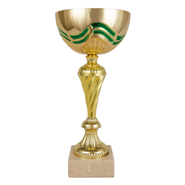 Copa comercial de color dorado y peana de mármol. Incorpora placa de aluminio con grabado láser. Disponible en 5 tamaños.