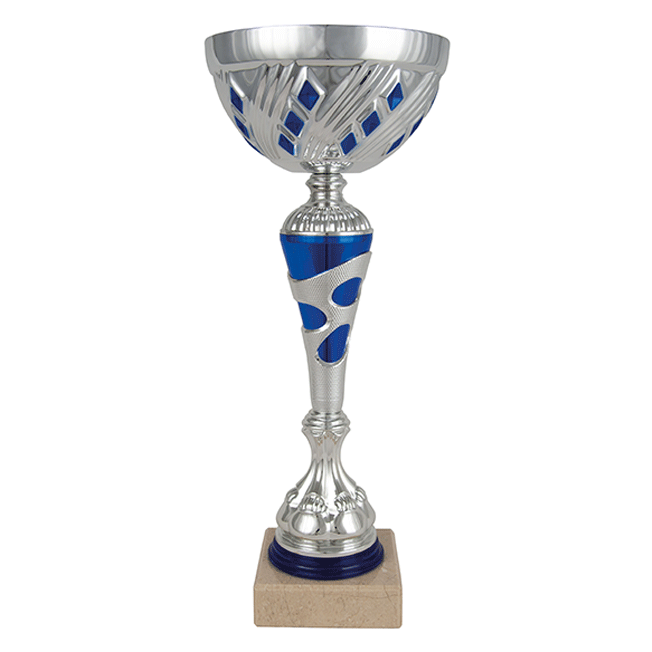Copa comercial con vaso plateado y peana de mármol. Incorpora placa de aluminio con grabado láser. Disponible en 5 tamaños.