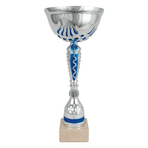 Copa comercial plateada con portacentro y peana de mármol. Incorpora placa de aluminio con grabado láser incluido y centro con aplique de Ø 25 mm con motivo a elegir. Disponible en 5 tamaños.