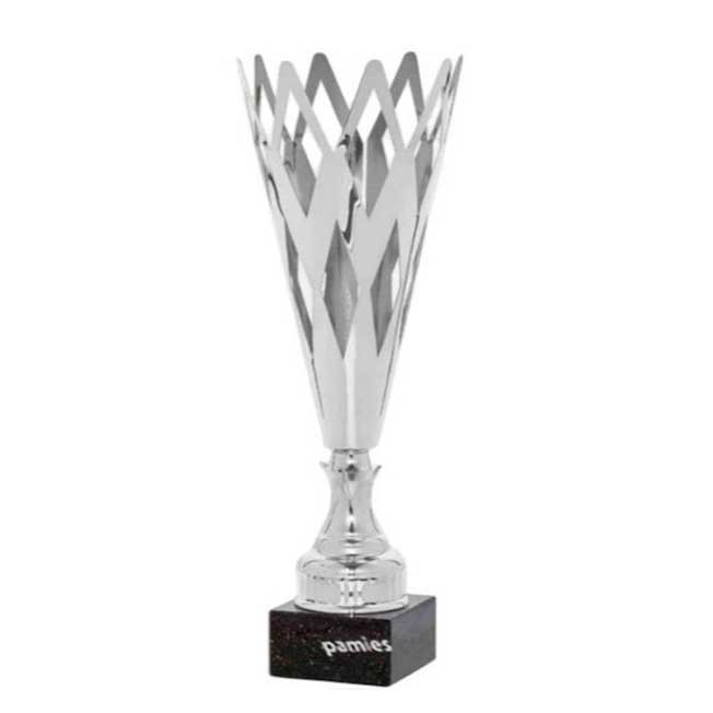 Trofeo en abs plateado. Realizada en mármol. Placa de aluminio con grabación láser incluida. La altura dependerá de la base. Disponible en 3 tamaños