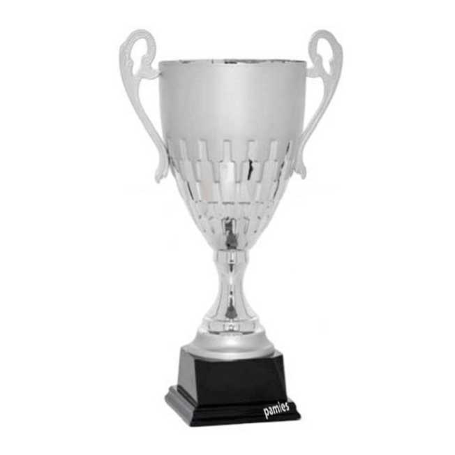 Trofeo metálico color plateado.