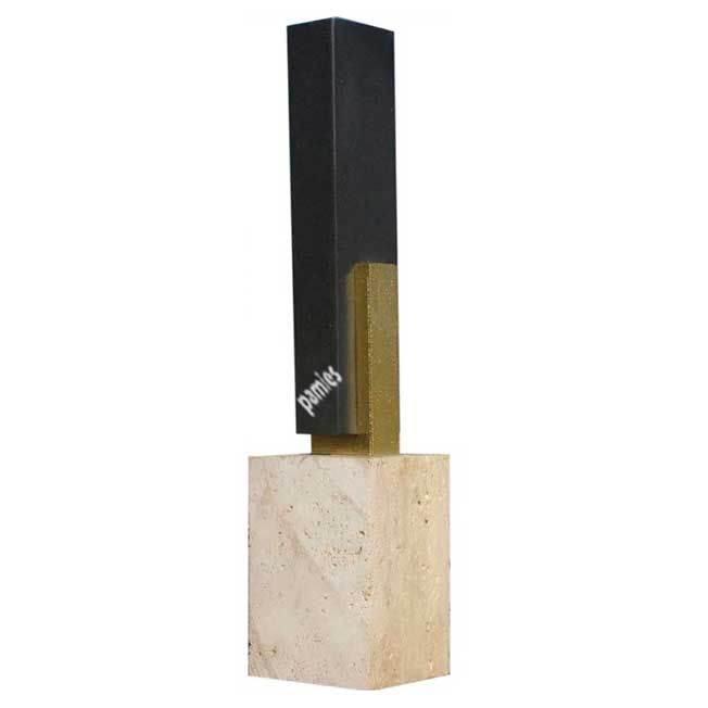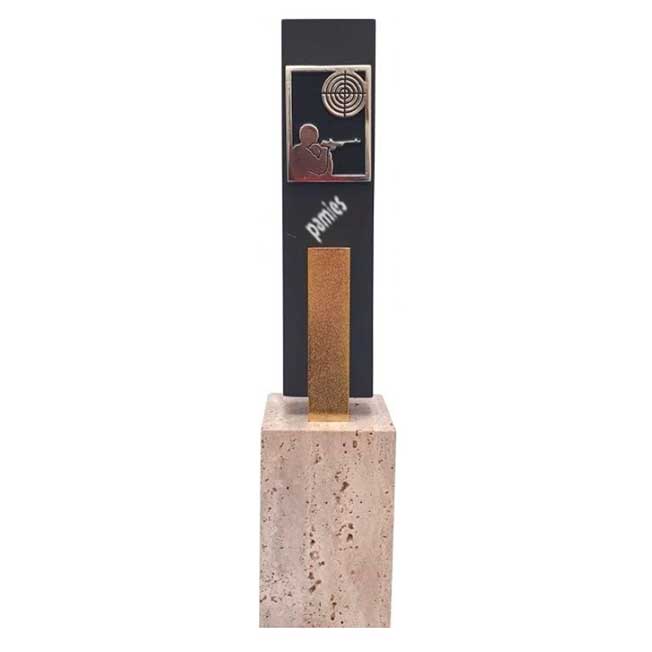 Trofeo escultura realizada en piedra y resina. Placa de aluminio con grabación láser incluida. La altura dependerá de la base.Disponible en 3 tamaños.
