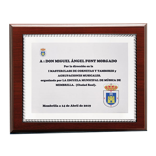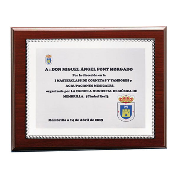 Placa homenaje de aluminio plateado grabado sublimación. Incluye estuche azul con cierre imantado y grabado con diamante. Disponible en 3 tamaños.