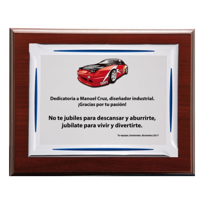 Placa homenaje de aluminio plateado y madera. Aluminio grabado a color por sublimación. Incluye estuche con cierre imantado. Disponible en 3 tamaños.