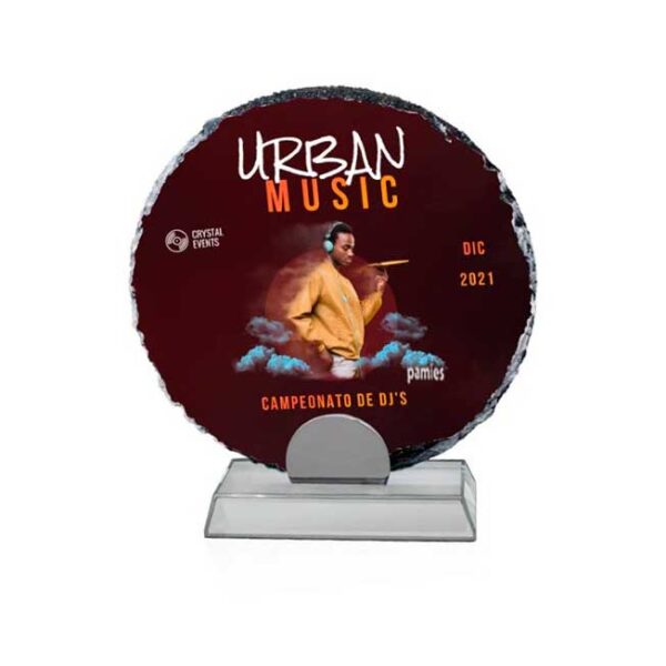 Placa homenaje de pizarra circular lacada, para imprimir cualquier texto o imagen en color, ya sea cubriéndola totalmente o parcialmente sobre el fondo blanco.