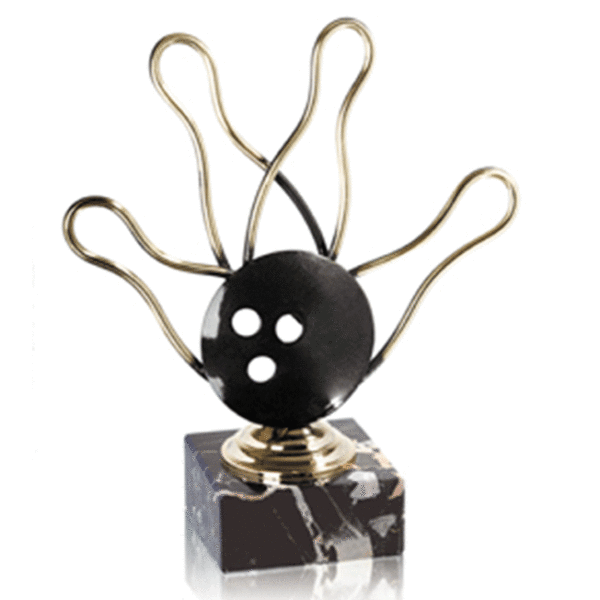 Trofeo bolos fabricado en metal y peana de mármol. Placa de aluminio con grabación incluida. Disponible en 3 tamaños