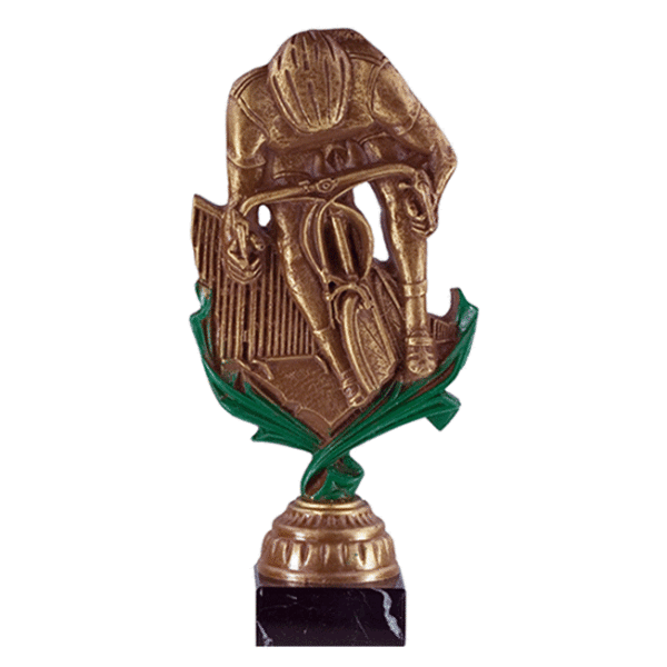 Trofeo fabricado con resina que incorpora motivo de ciclismo. Placa de aluminio con grabación incluida. La altura dependerá de la base. Disponible en 3 tamaños.