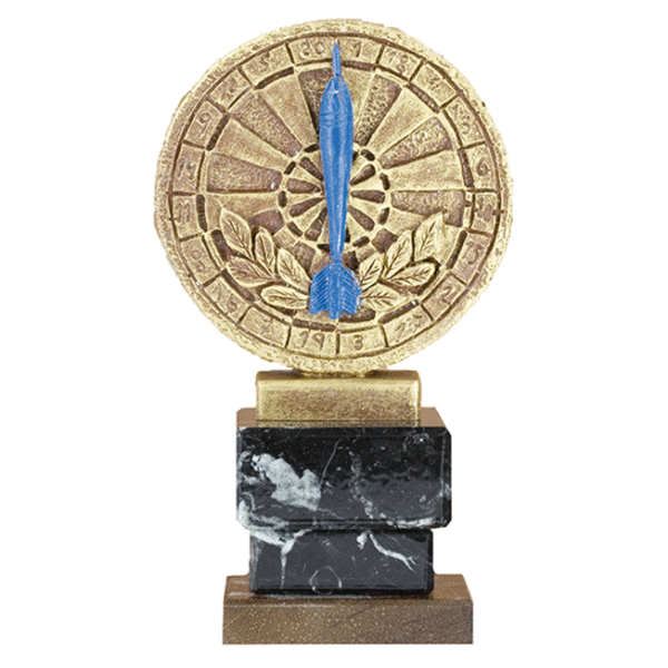 Trofeo fabricado con resina que incorpora motivo de dardos. Placa de aluminio con grabación incluida. La altura dependerá de la base. Disponible en 3 tamaños.