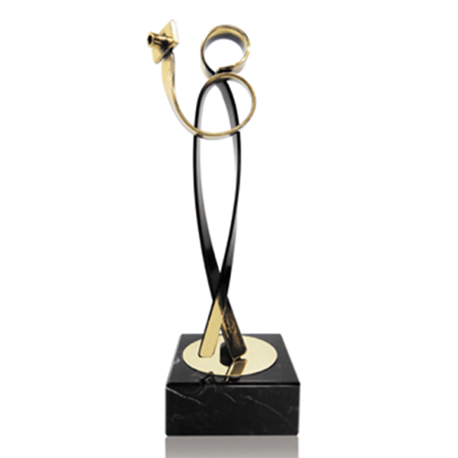 Trofeo metálico de latón con motivo de fotografía. Peana de mármol. Placa de aluminio con grabación láser incluida. Disponible en 3 tamaños