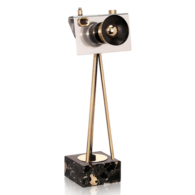 Trofeo metálico de latón con motivo de fotografía. Peana de mármol. Placa de aluminio con grabación láser incluida. Disponible en 3 tamaños
