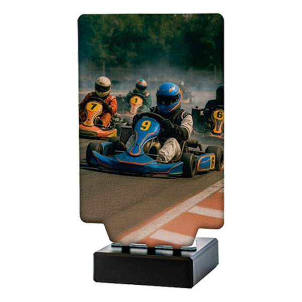 Trofeo fabricado en acero decorado con motivo de karts con peana negra de mármol. Placa de aluminio con grabación láser incluida. La altura dependerá de la base. Disponible en 3 tamaños.