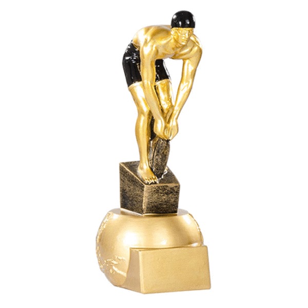 Trofeo natación de 20 cm de altura, fabricado en resina en una sola pieza. Placa de aluminio con grabación incluida. Disponible en 1 tamaño