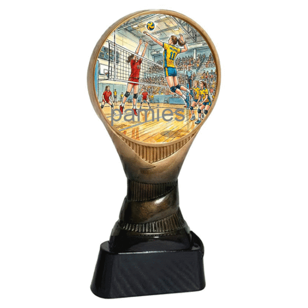 Trofeo de voleibol femenino, fabricado de resina decorada y que incorpora aplique en color de 8 cm. Placa de aluminio con grabación incluida. Disponible en 3 tamaños.